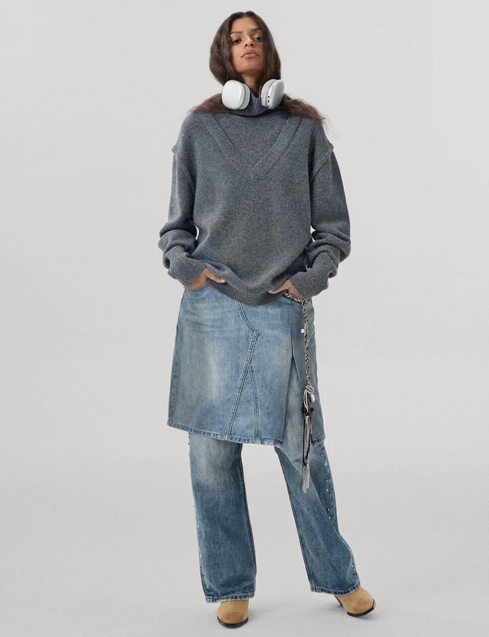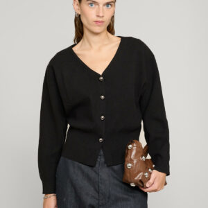 Chocolate brown asymmetric button sweater with attached wrap-around scarf.
