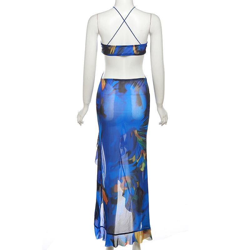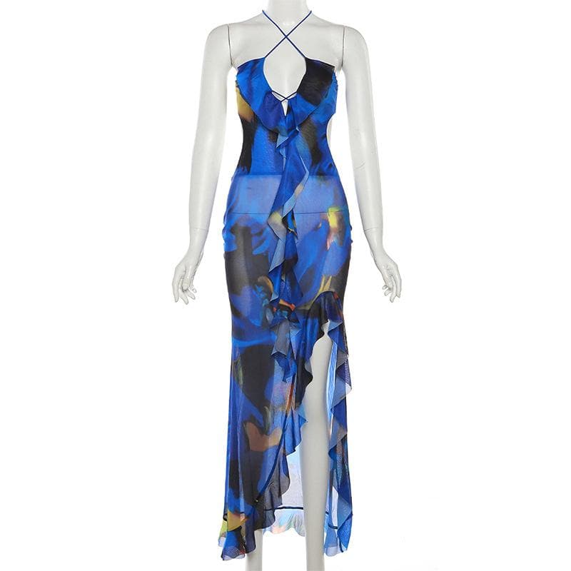 Cross front backless sheer mesh see through slit contrast print maxi dress