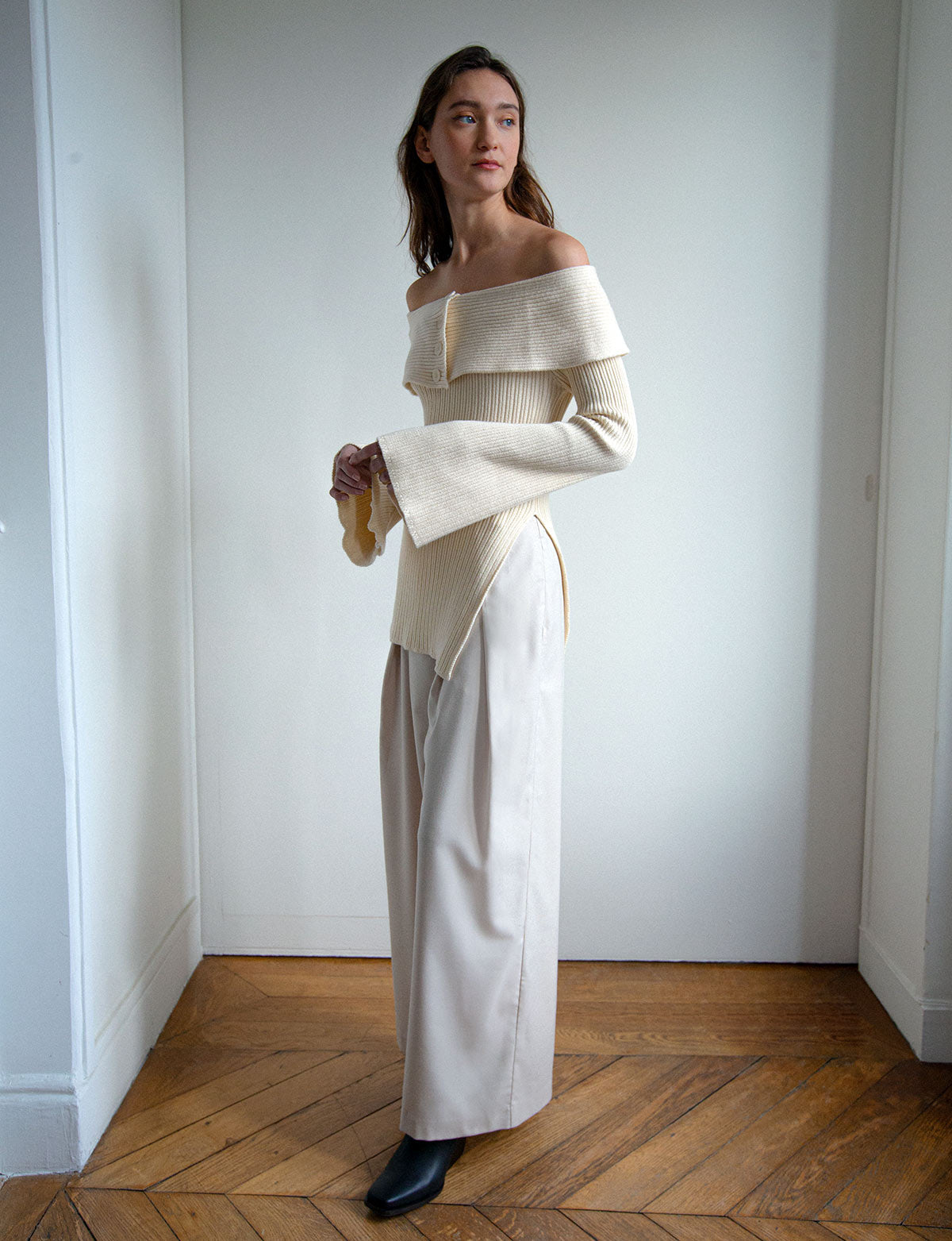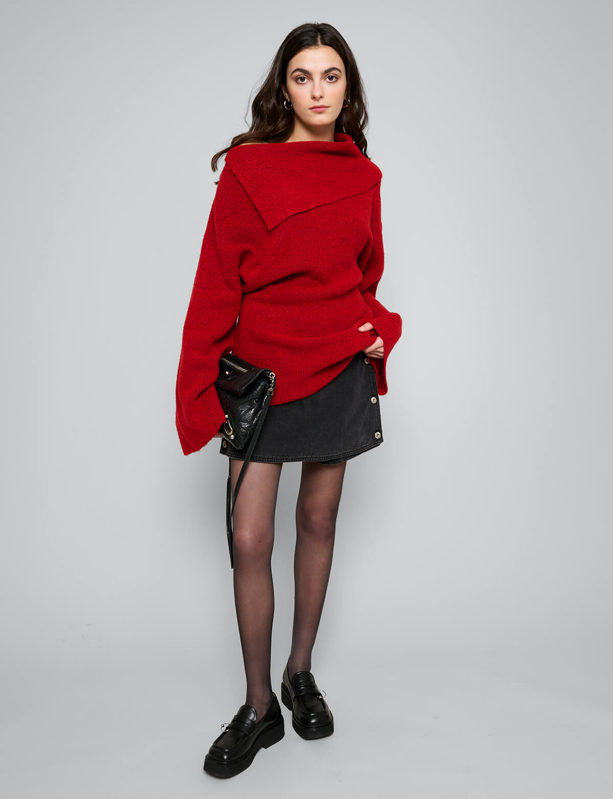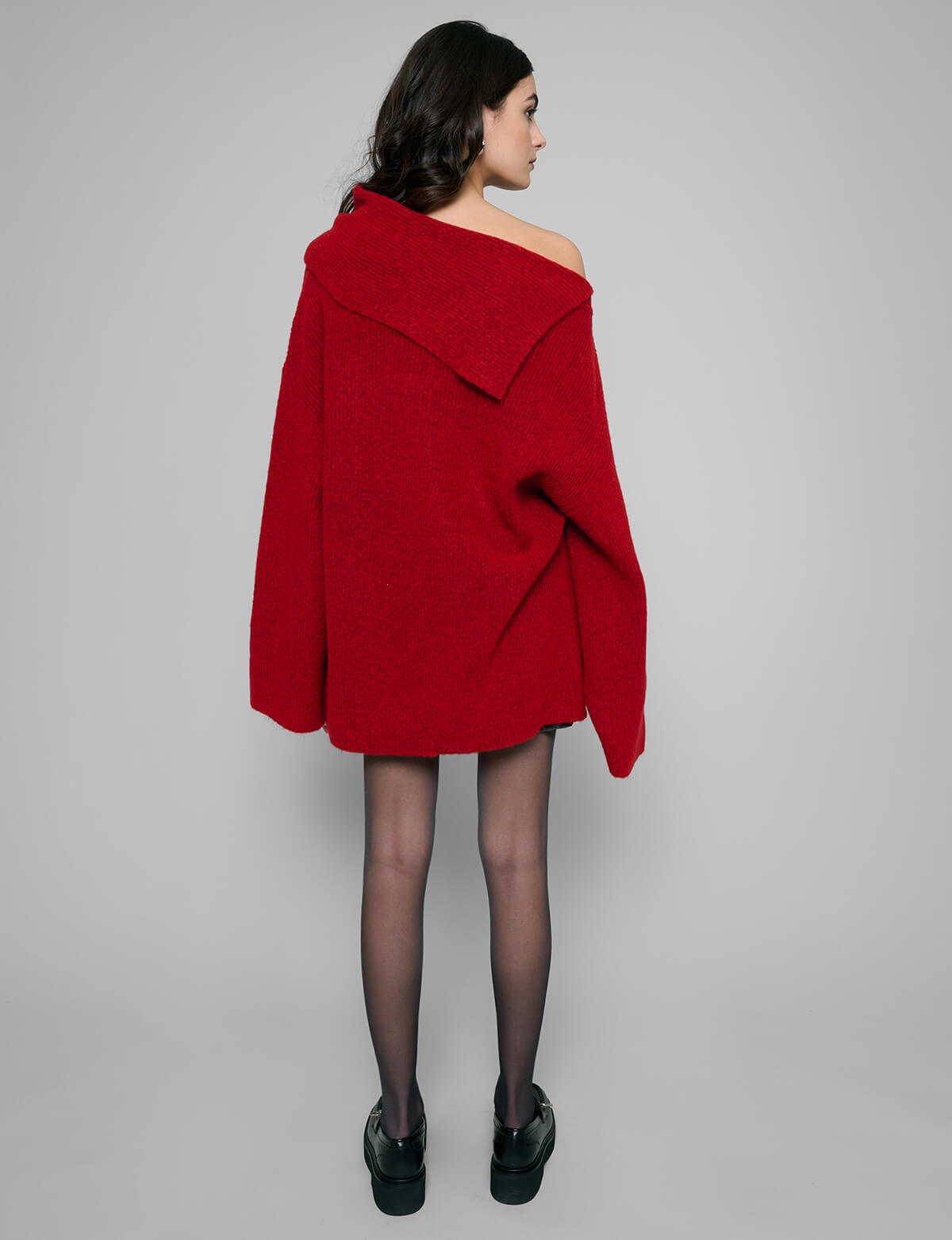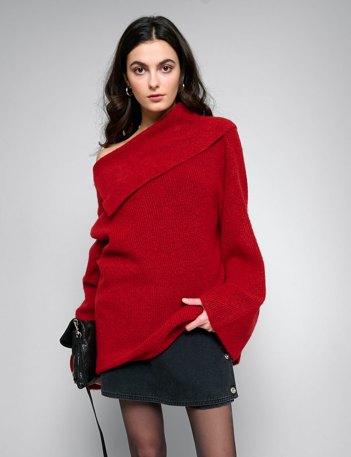 Asymmetric off the shoulder cherry red sweater with oversized sleeves .