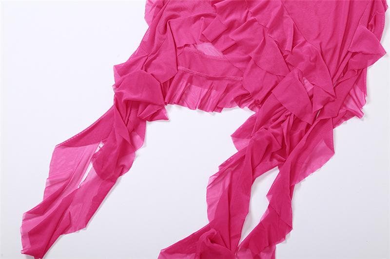 See through halter sheer mesh ruffle flower applique mini dress